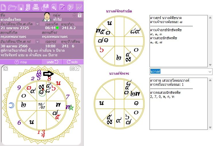 ๑. ดวงเมืองไทย เป็นดวงประเภท ปัศวะราศี การโคจรของลัคนาจร รอบละ ๔๒ ปี ขณะนี้เมืองไทย อายุ ๒๔๑ ปี การคิดอายุของดวงเมืองไทย ๔๒ คูณด้วย ๕ รอบเท่ากับ ๒๑๐ ปี เริ่มอายุจรที่ ราศีเมษ อายุ ๒๑๐ ปี บวกด้วย ๓๑ เท่ากับ ๒๔๑ ปี ฉะนั้น ๒๓๙ ปี ถึง ๒๔๔ ปี อายุจรสถิตราศีมังกร